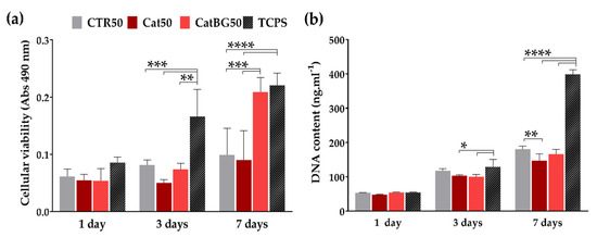 Cellular viability was evaluated by performing the MTS assay, where the metabolic activity of the cells can be achieved through the chemical reduction of the MTS compound to formazan. Overall, all conditions presented an increase in cell viability over the time (Figure 15a). Significant differences were only found at day 3, between the TCPS and the polymeric films, CTR50 and Cat50 (p < 0.001), and between the TCPS and CatBG50 (p < 0.01). At day 7, TCPS and CatBG50 presented the highest cellular viability, being very similar to each other. The significant differences of CatBG50 with the polymeric films revealed that the BGNPs’ inclusion allowed cells to express better metabolic activity.