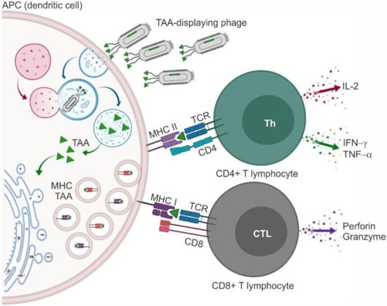 The use of phages as vaccine carriers, in addition, may provide some benefits in the induction of a cellular response due to the nature of phages themselves. Being recognized as foreign antigens, phage particles per se induce an immunogenic response in humans by activating the innate immune system and eliciting adaptive immunity [75]. Phage-displayed peptides are processed and exposed on the MHC, leading to stimulation of both CD4+ (MHC II) and CD8+ (MHC I) T lymphocytes and induction of strong cytotoxic responses, a key feature for vaccines in general and for anticancer vaccines in particular [76,77,78] (Figure 2).