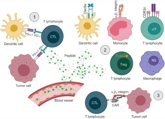 As small molecules easy to characterize and produce on a large scale, peptides are promising tools for targeted approaches in cancer immunotherapy. Initial studies investigated the use of peptides to stimulate the immune system indirectly. Successive reports focus on two main applications: interfering with immune checkpoints and modulating the activity of immune cells. These approaches are schematized in Figure 3.