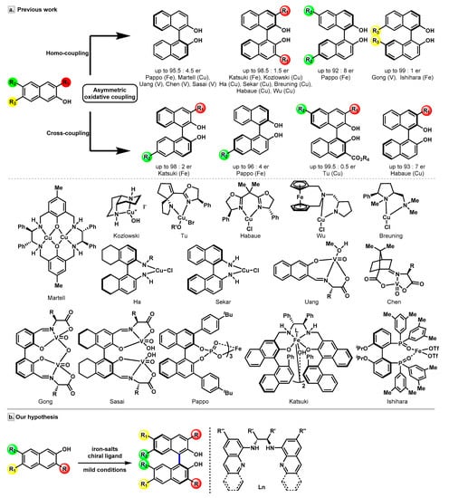 In the past few decades, enormous efforts have been devoted to the enantioselective assembly of BINOL scaffolds. Transition-metal-catalyzed asymmetric oxidative coupling of 2-naphthols have shown its power in the synthesis of BINOLs (Figure 2a). Efficient vanadium-catalyzed [21] protocols were reported by the Uang [22], Chen [23], Gong [24,25,26], and Sasai [27,28,29] groups, independently. Many research groups, including Nakajima, Kozlowski, and others, have successfully developed a series of copper-catalyzed coupling reactions of 2-naphthols [30,31,32,33,34,35,36,37,38,39,40,41,42,43,44]. Recently, a notable work by the Tu group [45] established a Cu/SPDO (spirocyclic pyrrolidine oxazoline) complex-catalyzed cross-coupling reaction to synthesize 3,3′-disubstituted BINOLs. Nevertheless, iron-catalyzed coupling strategies in this area have not been explored so far. Only a handful of remarkable iron catalysts, namely, an iron-salen complex reported by Katsuki and co-workers [46,47], a chiral diphosphine oxide–iron(II) complex developed by the Ishihara group [48], and an iron-chiral phosphoric acid (CPA) catalyst introduced by the Pappo group [49,50], have been disclosed to date (Figure 2a).