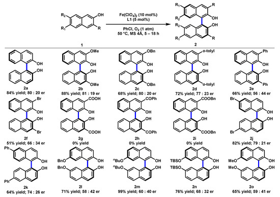 Next, we investigated the scope of the iron-catalyzed asymmetric oxidative coupling reaction, and the results were summarized in Scheme 1. A variety of substituted 2-naphthols with electronic and steric properties were examined. Substrate 1 containing functionalities at the C3-position, including OMe, OBn, o-tolyl, and Ph were successfully converted into the coupling products (2b–2e) in 56–88% yields with 56:44 to 81:19 er. The substrate bearing an electron-withdrawing Br substitution at the C3-position was also converted into the corresponding product (2f) in 51% yield with 79:21 er. The electronic effects of different functionalities are clearly demonstrated by the observation that electron-donating groups delivered higher yield (e.g., C3-OMe 88%, 2b vs. C3-Br 51%, 2f). However, C3-substituted substrates with carbonyl functionalities like CO2H, COPh, and CO2Bn failed to give any products (2g–2i). When C6-Br-substituted 2-naphthol was applied, the desired product (2j) was obtained in 82% yield with 79:21 er. A C6-phenyl-substituted 2-naphthol also resulted in 64% yield and 74:26 er (2k). Moreover, C7-substituted (BnO, nBuO, TBSO, and MeO) substrates were also effectively coupled and delivered the corresponding products (2l–2o) in 65–99% yields, albeit with dramatically diminished er.