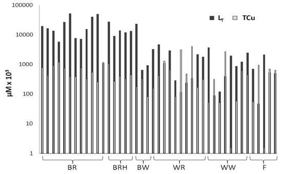 LT and TCu concentrations (logarithmic scale) in vinegars (BR: balsamic red vinegar, n = 12; BRH: balsamic red vinegar with honey, n = 5; BW: balsamic white vinegar, n = 3; WR: wine red vinegar, n = 10; WW: wine white vinegar, n = 8; F: fruit vinegar, n = 5).
