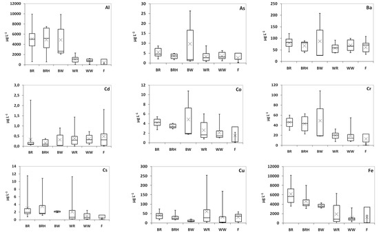 Precision repeatability (n = 5) was <15% for all trace metals. The LODs (in μg L−1) were equal to 0.02 for Co and Cs; 0.03 for Cd, 0.05 for As, Pb, and V; 0.10 for Ba, Cr, Rb, and Sr; 0.20 for Mn, 0.40 for Cu and Ni; 1.0 for Zn; 2.0 for Al; and 3.0 for Fe [60]. For statistical calculations, values below the LOD were assigned the limit of detection divided by 2.