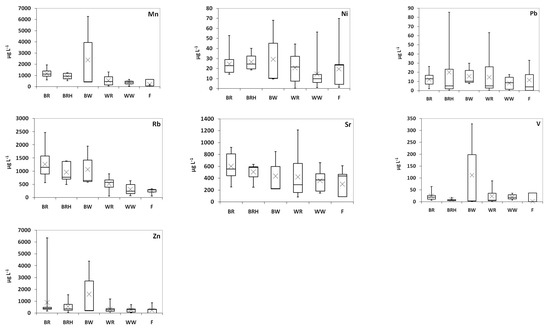 Plots of trace metals determined for all vinegar samples examined. The mean value is displayed with x. (BR: balsamic red vinegar; BRH: balsamic red vinegar with honey; BW: balsamic white vinegar; WR: wine red vinegar; WW: wine white vinegar; F: fruit vinegar).