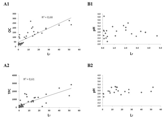 Correlation of LT (μM) with organic carbon (OC) (mg L−1) (A1) and total phenolics (TPC) (mg GAE L−1) concentrations (A2) and correlation of LT with pH values in common (B1) and balsamic vinegars (B2).