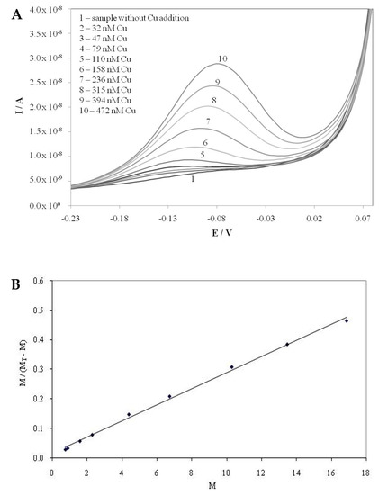 DPASV voltammograms of Cu ion titrations (A) and Ruzic–van den Berg plot (B) for the balsamic vinegar sample BR5.