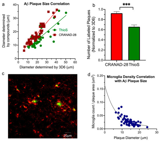 (a) Correlations between CRANAD-28 labeling, ThioS and 3D6 antibody staining. It can be seen that in the term of plaque size CRANAD-28 has a better correlation with 3D6; (b) consistency count comparation between CRANAD-28 and ThioS. Ratio of stained number of plaques compared as ratios CRANAD-28:3D6 and ThioS:3D6; p value *** < 0.001. (c) representative image of plaque staining with CRANAD-28 (green) and microglia staining with IBA-1(red); (d) correlation between diameter of plaques labeled with CRANAD-28 and microglia density taken as microglia count divided by plaque area. Rs = −0.70, p < 0.001.