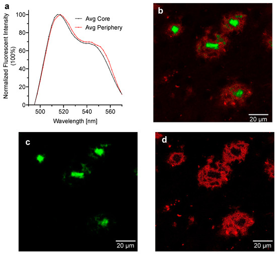 (a) Emission spectra peaks from 5× FAD transgenic mouse brain sections stained with CRANAD-28; (b) Merged confocal microscope images Aβ plaques from the unmixed image of core (green) and the unmixed image of periphery (red). 488 nm excitation, 40× objective, zoom 2×; (c) confocal microscope image of the unmixed core component using the extracted spectra; and (d) confocal microscope image of the unmixed periphery component using the extracted spectra.