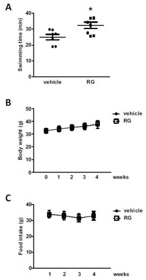 We employed the exhaustive swimming test model to evaluate exercise performance in mice []. The concentration of RG for the animal experiment was chosen based on previous reports [,,]. The animals were fed with 100 mg/kg of RG for 28 days and assessed for swimming endurance. RG supplementation increased swimming time by approximately 30% compared to the vehicle-treated control group (24.92 ± 1.61 min and 32.36 ± 1.97 min, respectively, Figure 1a). There were no noticeable changes in body weight or food intake level associated with RG supplementation (Figure 1B,C).