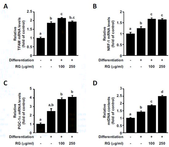 Effects of RG on mitochondrial biogenesis. Cells were induced to differentiate for 2 days, and then cells were treated with 100 or 250 μg/mL of RG for 48 h. (A–C) Relative mRNA expressions of nuclear respiratory factor 1 (NRF-1), mitochondrial transcription factor A (TFAM), and PPAR gamma coactivator 1-alpha (PGC-1α) were detected using real-time PCR analysis. The expression levels were normalized to that of GAPDH. (D) Mitochondrial DNA (mtDNA) copy number was measured. Data are expressed as mean ± S.D. Bars with different letters mean significant differences from each other (p < 0.05).