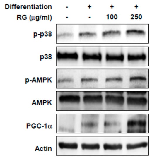 Effects of RG on phosphorylation levels of p38, AMP-activated protein kinase (AMPK) and PGC-1α in C2C12 myotubes. Cells were induced to differentiate for 2 days, and then cells were treated with 100 and 250 μg/mL of RG for 48 h. Cell lysates were immunoblotted with antibodies against phosphorylated-p38 MAPK (p-p38), phosphorylated AMPK (p-AMPK), total p38, AMPK, PGC-1α and actin as a loading control.