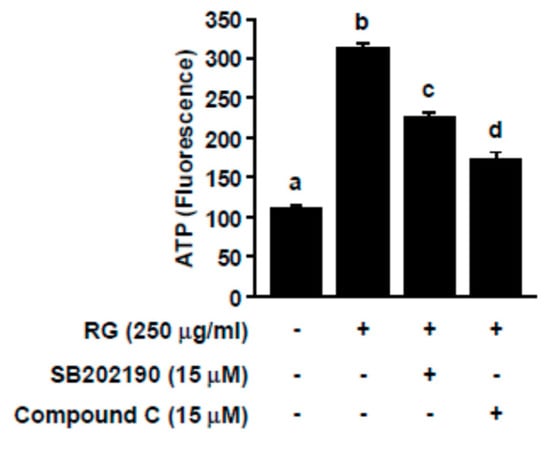 To further assess the involvement of p38 and AMPK in RG-mediated ATP production, we co-treated SB202190 or dorsomorphin (i.e., compound C) with RG. SB202190 and dorsomorphin function as p38 and AMPK inhibitors, respectively. RG-mediated increases in ATP production were negated by SB202190 and dorsomorphin in C2C12 myoblasts (Figure 5). These data demonstrated that RG enhances ATP production through the AMPK and p38 signaling pathway.