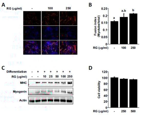 Murine C2C12 myoblasts were purchased from the American Type Culture Collection (Mannassas, VA, USA) and maintained at 37 °C in a humidified atmosphere under 5% CO2. Cells were cultured in high-glucose Dulbecco’s modified Eagle’s medium (DMEM, Life Technologies, Carlsbad, CA, USA) with 10% fetal bovine serum (FBS, GIBCO, Grand Island, NY, USA) and antibiotics (Life Technologies, Carlsbad, CA, USA). Muscle differentiation was induced with differentiation medium containing 2% horse serum (GIBCO, Grand Island, NY, USA). After 2 days, the differentiated C2C12 cells (D2) were further treated with RG (100, 250 µg/mL) for an additional 2 days, before the samples were collected.