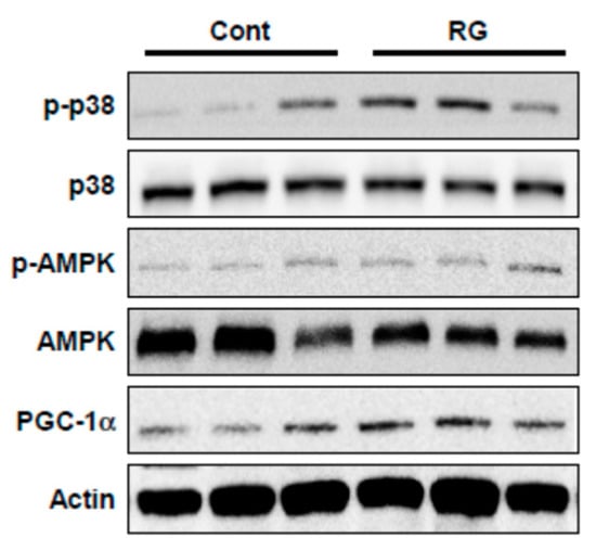 Effects of RG on protein expression in the muscles of mice fed a vehicle or RG. Mice were fed with vehicle or 100 mg/kg RG for 28 days. Muscle tissue (tibialis anterior) lysates were immunoblotted with antibodies against phosphorylated-p38 MAPK (p-p38), phosphorylated AMPK (p-AMPK), total p38, AMPK, PGC-1α, and actin as a loading control.