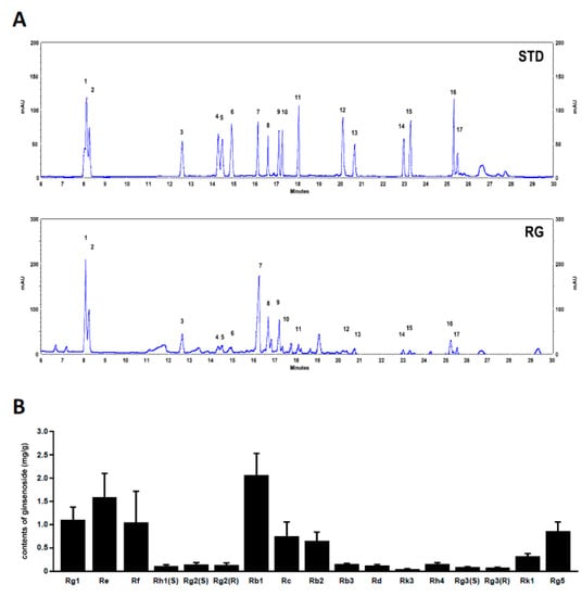 Ultra-performance liquid chromatography (UPLC) analysis of ginsenosides in RG. (A) The chromatograms of the standard mixture and RG. Peaks: 1; Rg1, 2; Re, 3 Rf, 4; Rh1, 5; Rg2(S), 6; Rg2(R), 7; Rb1, 8; Rc, 9; Rb2, 10; Rb3, 11; Rd, 12; Rk3, 13; Rh4, 14; Rg3(S), 15; Rg3(R), 16; Rk1, 17; Rg5. (B) Contents of 14 ginsenosides in red ginseng (mg/g). Characterization and quantification ginsenosides in RG were conducted using ginsenoside standards.