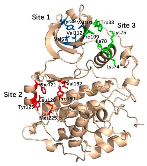 Allostery is the regulation of macromolecule function through the binding of a modulator to an allosteric site thatis spatially and topographically distinct from its orthosteric site. Therefore, allosteric sites areregarded as attractive targets to develop non-ATP-competitive kinase inhibitors [13,14,15]. By targeting the much more diversified allosteric site relative to the highly conserved ATP-binding pocket, allosteric inhibitors might avoid the drawbacks of most conventional ATP-competitive inhibitors with theirenhanced selectivity and reduced toxicity. For example, the subtype selective PDE4D allosteric inhibitor BPN14770 exhibited reduced vascular toxicity over earlier PDE4 inhibitors that lacked the subtype selectivity [16], and compound 8t, as the allosteric inhibitor of phosphoglyceratemutase 1, was demonstrated to delay tumor growth in the H1299 xenograft model without the obvious toxicity [17]. Notably, the identification of CK2 allosteric sites is a prerequisite tothe discovery of allosteric inhibitors. To date, six allosteric sites of CK2α have been identified using the combination of bioinformatics and biochemistry methods [18], and three well-elucidated sites among them have been targeted to discover CK2 allosteric inhibitors. As shown in Figure 1, Site 1, α/β interface (Tyr 39, Val67, Val112 and Val101) has been confirmed to be occupied by the DRB, cyclic peptide (Pc) and W16 [19]. The αD pocket named Site 2 was demonstrated as the allosteric pocket including Phe121, Pro125, Leu128, Pro159, Val162 and Met225. Recently, Bestgen et al. discovered aminothiazole derivatives as the allosteric modulators of CK2 by targeting the interface between the αC helix and the glycine-rich loop (G-loop) [20].