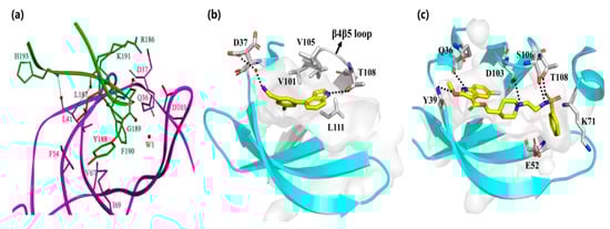 In parallel with efforts to develop peptide-based inhibitors, compound 4 was optimized and validated to bind at the α/β interface based on the lead compound discovered by virtual ligand docking and screening [32]. As shown in Figure 3, the fluorinated indole ring was buried in the hydrophobic pocket consisting of L41, F54, V67, V101, P104, V105, A110, and V112. Additionally, Q36 and Y39 formed polar interactions with the -NH- of the indole ring and the oxygen atom of ester, respectively. The left part, linked with ester, extended toward the top of the kinase P-loop with a salt bridge interaction between the nitrogen of the piperidine ring andthe carbonyl of D103, as well as the hydrogen bond between sulfonamide and S106 and T108 of the β4–β5 loop (Figure 3b). Enzymatic assay confirmed that compound 4 blocked the CK2α/CK2β interaction and inhibited phosphorylation of CK2β-dependent substrates. Furthermore, this compound exhibited better cell permeability than Pc with the impeded cell growth, migration and induced cell death effects on triple-negative breast cancer cells (MBA-MB-231). Therefore, this compound is the first example of a rationally designed small molecule that efficiently displaces CK2β from CK2α in the cellular context.