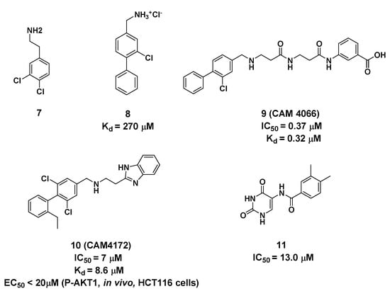 However, becauseCAM4066 interacted with the αD pocket (Figure 5) and the positive area of the ATP-binding pocket simultaneously, despite its potent inhibition effect and high selectivity, this compound may not be considered as aclassic allosteric inhibitor which binds completely outside the orthosteric pocket. With the aimofdeveloping improved αD-site binding inhibitors without reaching deep into the ATP-binding pocket, the second generation inhibitor CAM4712 (IC50 = 7 μM) [38] was designed by growing benzimidazole fragments near, but not inside, the mouth of ATP sites, which is are markable improvement relative to CAM4066. Similar to compound CAM4066, NH was entrapped in the hydrophobic site and formed an H-bond with Pro159 and Val162. Meanwhile, the benzimidazole fragment formed the π–π interaction with His160. Competition experiments further confirmed that CAM4712 was the potent and selective allosteric inhibitor by binding in the αD pocket without facilitatingcellular uptake.