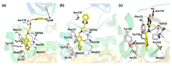 Using a high concentration crystallographic screen method, compound 7 was identified asbinding in the αD site, but with lower Kd values (Figure 4) [35]. The amine formed hydrogen bonds with the backbone carbonyls of V162 and P159, and the phenyl were accommodated into the hydrophobic pocket. Based on compound 7, the replacement of the chlorine atom at Position 4 with a phenyl ring was optimized to make it bind more deeply into the αD pocket. As a result, compound 8 showed the higher affinity of 270 μM, although without any inhibition of CK2 kinase activity. With the introduction of the optimized flexible linker combining two pharmacophoric fragments, CAM4066 was synthesized and showed potent inhibitory effects and good selectivity on CK2α (IC50 = 0.37 μM) [36]. As shown in Figure 5, the two pharmacophoric fragments were involved in forming hydrogen bonds with Pro159, Val162 and Lys68, respectively, while the linker formed the H-bonds with Asn118. Appropriate coupling between the linker and pharmacophore fragments was essential for the binding of CAM4066 with CK2α. Our group explored the structural mechanism for the decreasedinhibitionof the rigid linker and non-ionizable substituted fragment (pre-CAM4066) against CK2 by molecular dynamics simulation (MD) studies [37].