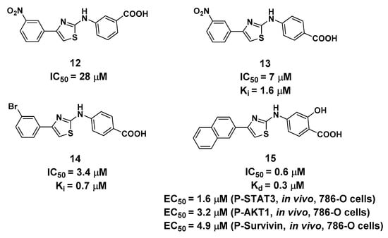 The serendipitous discovery of 2-aminothiazole derivatives (Figure 6) targeting the interface between the G-loop and αC-helixis very intriguing [20,40]. Originally, Lomberget et al. aimed to identify hits targeting the CK2α/CK2β interface using virtual ligand screening, and compound 12 was evaluated as the most active hit with an IC50 value of 28 μM for CK2α. However, elaborate biochemical experiments validated that compound 12 was not bound to the CK2α/CK2β interface, and its inhibitory effects on CK2 wereindependent of the concentrations of both ATP, peptide substrate, and the presence of CK2β. Further experiments were performed on compound 13, which shared the same inhibition pattern as compound 12, but with improved inhibitory effects (IC50 = 7.0 μM) and higher selectivity with CK2α.