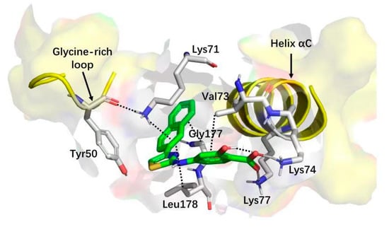 The structure–activity relationship indicated that the aminothiazole core and a carboxylic acid function were essential for inhibitory activity. By combining the saturation transfer difference NMR competition experiments, alanine scan mutational analysis, the native mass spectrometry-based detection, and molecular docking, the 2-aminothiazole derivatives were predicted to bind in the interface between the G-loop and αC-helix by forming anH-bond, salt bridge (carboxylate with Lys74 and Lys77) or cation-π interactions (naphthalene ring with Lys71) as shown in Figure 7. After the systematical optimization on the position 4 and amine of the aminothiazole core, compound 15 was identified as having submicromolar potency against CK2α (IC50 = 0.6 μM) with pro-apoptotic and anti-cell growth effects. As Site 3 is less conserved in the human kinome, the overall selectivity of 15, as expressed by a Gini coefficient of 0.78,was higher than that of CX-4945 (Gini coefficient of 0.67), in particular, the main off-targets of CX-4945, Clk2 and Dyrk1A were not or were only weakly inhibited by 15, respectively.