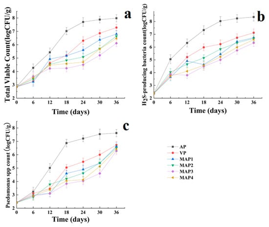 Changes in total viable count (a), Pseudomonas spp. (b), and H2S-producing bacteria (c) of Chinese sea bass during superchilling storage at −0.9 °C. AP: air package; VP: vacuum package; MAP1: modified atmosphere packaging with 40% CO2/60% N2; MAP2: modified atmosphere packaging with 40% CO2/10% O2/30% N2; MAP3: modified atmosphere packaging with 60% CO2/10% O2/30% N2; MAP4: modified atmosphere packaging with 60% CO2/40% N2.