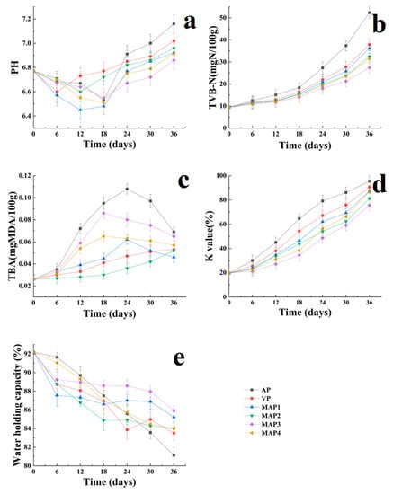 Changes in pH values (a), total volatile basic nitrogen (TVB-N) values (b), thiobarbituric acid reactive substances (TBARS) values (c), K values (d), and water holding capacity (WHC) values (e) of Chinese sea bass during superchilling storage at −0.9 °C. AP: air package; VP: vacuum package; MAP1: modified atmosphere packaging with 40% CO2/60% N2; MAP2: modified atmosphere packaging with 40% CO2/10% O2/30% N2; MAP3: modified atmosphere packaging with 60% CO2/10% O2/30% N2; MAP4: modified atmosphere packaging with 60% CO2/40% N2.