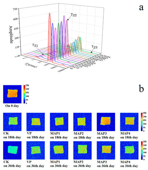 Changes in water distribution (a) and magnetic resonance imaging (b) of Chinese sea bass during superchilling storage at −0.9 °C. AP: air package; VP: vacuum package; MAP1: modified atmosphere packaging with 40% CO2/60% N2; MAP2: modified atmosphere packaging with 40% CO2/10% O2/30% N2; MAP3: modified atmosphere packaging with 60% CO2/10% O2/30% N2; MAP4: modified atmosphere packaging with 60% CO2/40% N2.