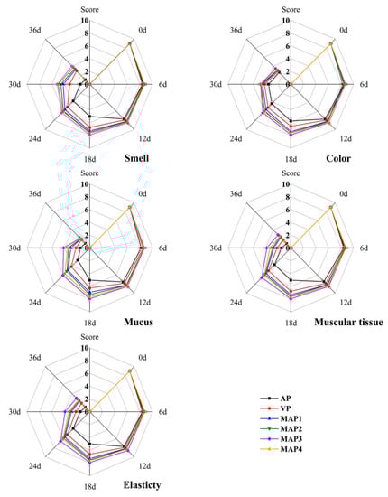 The organoleptic evaluation results including smell, color, mucus, muscular tissue, and elasticity of Chinese sea bass samples during superchilling storage at −0.9 °C for 36 days are presented in Figure 4. On 0 day, all samples had high organoleptic scores, indicating excellent quality. However, the quality of all sea bass samples decreased significantly (p < 0.05) with the increasing storage time. The organoleptic results showed that the gelatin active coating containing eugenol and the MAP treated sea bass samples had significantly higher scores than that of the AP and VP treated samples. On 18th day, the score of the AP treated samples was lower than 5, which was considered as an unacceptable value for sea bass samples in the present research. The gelatin active coating containing eugenol and the MAP treated sea bass samples exceeded the limitation on 30th day except for the MAP3 treated samples. Therefore, this method of treating with active coatings containing eugenol and MAP treatments could be an effective way to retard the quality deterioration and maintain the organoleptic quality of sea bass samples. Compared with the microbiological and chemical results, the organoleptic evaluation results showed some retardation in the quality evaluation of sea bass samples during superchilling storage. This was probably due to the organoleptic evaluation being subjective; and the quality deterioration appeared inside the sea bass samples first, which is usually difficult to observe in time by visual inspection [77,78]. Therefore, it should be suitable to examine the storage quality of sea bass samples by the comprehensive analysis of microbiological, chemical, and organoleptic evaluation.