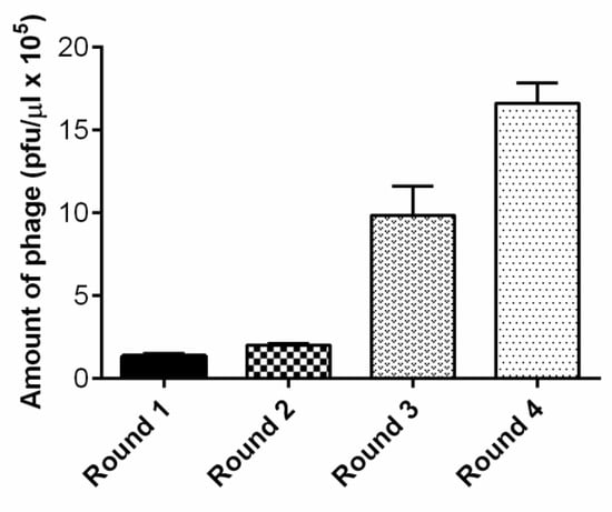 Briefly, the phages were amplified by adding 200 µL of the eluate to 50 mL of E. coli cells (OD600 = 0.6, New England Biolabs) and then vortexed and incubated for 4 h at 37 °C with vigorous shaking. The culture was transferred to a centrifuge tube and spun for 20 min at 5000 rpm at 4 °C. The upper part of the supernatant was transferred to a fresh tube, and 18 mL of 20% PEG with 2.5 M NaCl was added. The phage was allowed to precipitate 24 h at 4 °C. The following day, the phages were precipitated by centrifugation for 30 min at 5000 rpm at 4 °C. The supernatant was discarded, and the pellet was resuspended in 1 mL of PBS and transferred to a new tube. The residual cells were discarded by centrifugation for 10 min at 20,000 rpm at 4 °C. The supernatant was recovered in a new tube. A second precipitation was performed with 200 µL of 20% PEG with 2.5 M NaCl for 1 h in ice. The phages were recovered by spinning for 30 min at 20,000 rpm at 4 °C. The supernatant was discarded, and the pellet was dissolved in 200 µL of PBS and used for the next round of bio-panning. Serial dilutions of phages were prepared in LB medium (106–1010 fold for amplified phage culture supernatant and 101–104 fold for unamplified panning eluates). Ten microliters of each phage dilution were added to 200 µL of Escherichia coli cells and then vortexed and incubated for 5 min. The infected phages were transferred to LB/IPTG/X-gal plates. The plates were incubated overnight at 37 °C and the plaques were counted to obtain the titer in plaque-forming units (pfu):