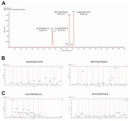 To verify the identity of peptides and to characterize fragments, we performed high-resolution mass spectrometry analysis using the Synapt-G2Si instrument. As shown in Figure 3A, the total ion chromatogram showed four major peaks at retention times from 24–34 min. The main peaks in the total ion current (TIC) spectrum were identified as predicted peptide GLHTSATNLYLH (24.85 min, m/z 965.5020), peptide HLYLNTASTHLG (25.12 min, m/z 965.5020), peptide WPVYIEGTRAAV (30.81 min, m/z 965.5020), and peptide VAARTGEIYVPW (32.32 min, m/z 965.5020). The MS/MS fragmentation spectra clearly confirmed the identity of the transported peptides (Figure 3B,C).