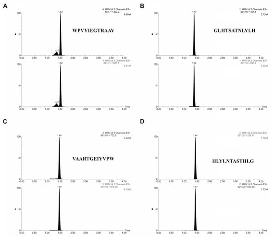 Quantitative analysis of peptides was carried out by ultra-performance liquid chromatography-tandem mass spectrometry using ACQUITY ultra-performance liquid chromatography (UPLC) I-class system coupled to a triple-quadrupole mass spectrometer Xevo TQD. Two characteristic fragments for each peptide were selected for quantification experiments. For the optimal separation, the gradient elution program was established, using water with formic acid and acetonitrile. Table 2 demonstrates the mass spectrometry parameters used for analysis. The retention time for targeted analytes was 1.40 min for VAARTGEIYVPW peptide, 1.44 min for WPVYIEGTRAAV peptide, 1.52 min for GLHTSATNLYLH peptide, and 1.48 min for HLYLNTASTHLG peptide. Figure 4 displays a typical chromatogram of targeted analytes in standard solution.