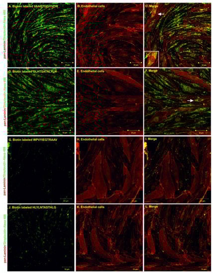 Confocal microscopy of endothelial cells after 1 h of co-incubation with VAARTGEIYVPW (A–C), GLHTSATNLYLH (D–F), WPVYIEGTRAAV (G–I) and HLYLNTASTHLG (J–L) peptides. Biotinylated peptides are shown in green and pan-laminin signal is shown in red. White arrows indicate examples of the internalization of peptides into endothelial cells. Scale bar = 50 µm.