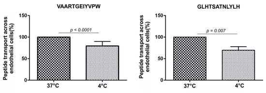 To test the effect of temperature on the transport of peptides across BBB, endothelial cells were incubated with peptides at 4°C to reduce cell metabolism which slows down endocytosis. We observed that lower temperatures affected endocytosis and peptide permeability across the BBB model. The permeability of VAARTGEIYVPW was reduced by 30.5% at 4°C (37 °C: 100%; 4 °C: 69%; n = 6; p > 0.0001). The permeability of GLHTSATNLYLH was reduced by 20.5% at 4°C (37 °C: 100%; 4 °C: 79%; n = 6; p > 0.007). This result indicates that the tested peptides were internalized into endothelial cells by an energy-dependent process (Figure 6).