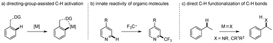C-H bonds belong to the most common motifs in organic molecules and their direct functionalization is one of the main challenges in synthesis methodology, which impacts on the step economy and sustainability of chemical processes. In recent decades, this research area has flourished and different approaches have been realized to enable C-H functionalization reactions via different strategies: (a) by the directing group-assisted C-H activation, (b) via the innate reactivity of organic molecules, or (c) via direct C-H functionalization (Scheme 1) [1,2,3,4]. While the introduction and subsequent removal of directing groups is a prerequisite for directed C-H activation, direct C-H functionalization allows the introduction of new functional groups into organic molecules without the need for directing groups. It thus represents the most efficient and step-economic strategy by which to conduct C-H functionalization reaction. The challenge of this strategy lies within the selective activation of only one type of C-H bond; elegant methods have been developed in recent years, mainly relying on the use of expensive and mostly toxic precious metal catalysts based on rhodium, iridium, palladium, and others to direct the C-H functionalization reaction as either the catalyst or the substrate [5,6,7].