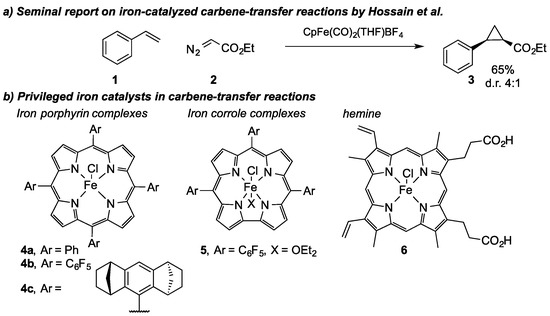 (a) Seminal iron-catalyzed cyclopropanation by Hossain et al. [22]. (b) Privileged iron catalysts in carbene-transfer reactions.