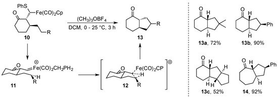 Initial applications of iron carbene complexes in C-H functionalization reactions involved the use of preformed iron carbene complexes 10 that were used in intramolecular C-H insertion reactions. The nature of the preformation of the iron carbene complex renders these applications stoichiometric in iron. Following this methodology, C-H insertion occurs selectively to form cyclopentane ring systems (13,14). The corresponding bi- and tricyclic target structures can be obtained with high trans-selectivity (Scheme 5) [28]. The same authors investigated the selectivity of this process in further studies and explained the observed reaction outcome via a concerted C-H insertion reaction that proceeds via a chair-like cyclic transition state (12, Scheme 5) [29,30].