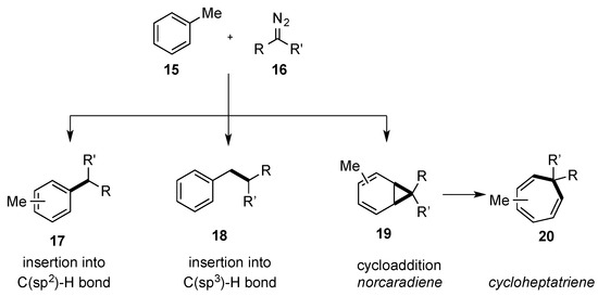 The direct C-H functionalization of benzene or alkyl benzenes (15) via carbene or metal-carbene intermediates can give access to three different products, which arise from (a) insertion into a C(sp2)-H bond (17), (b) insertion into a side-chain C(sp3)-H bond (18), or (c) a cycloaddition reaction with the aromatic system to give a norcaradiene 19 that can undergo a Buchner reaction to give a cycloheptatriene 20 (Scheme 6). The challenge lies in the chemoselective differentiation of these three reaction pathways. Moreover, a C-H insertion into a C(sp2)-H bond may give rise to different regioisomers.