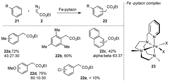 In this context, Luis, Perez, and coworkers reported on the use of iron(II)-complex (23) bearing a pytacn ligand in the reaction of ethyl diazoacetate 2 with aromatic hydrocarbons (21). Under these reaction conditions, ethyl diazoacetate (2) underwent a chemoselective C-H functionalization of the aromatic C(sp2)-H bond of benzene and alkyl benzene derivatives, and only trace amounts of the norcaradiene/cycloheptatriene reaction pathway were observed [31]. The substrate scope of benzene derivatives was further studied by the same authors and, in all cases, exclusive C(sp2)-H bond insertion occurred in moderate to good yields as a mixture of regioisomers. Electron-withdrawing groups (e.g., Cl) had a detrimental effect on the C-H functionalization reaction, and the corresponding products were obtained with reduced yields (Scheme 7) [32].
