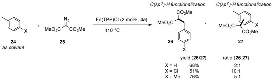 The direct C-H functionalization reaction of aromatic compounds (used as solvents) was also studied by Woo and coworkers using dimethyl diazomalonate 25 and an iron(III) porphyrin complex (4a) as a catalyst at elevated reaction temperatures. However, only moderate chemoselectivity of C(sp2)-H bond vs. C(sp3)-H bond insertion could be achieved in this reaction (26:27, 2:1 to 10:1). Different substituted aromatic systems such as toluene, mesitylene, 4-chloro-toluene, or anisole were shown to be compatible with the present reaction conditions. In contrast to the previously described reaction, the product from the C(sp3)-H bond insertion reaction was obtained as the major product (Scheme 9) [34].