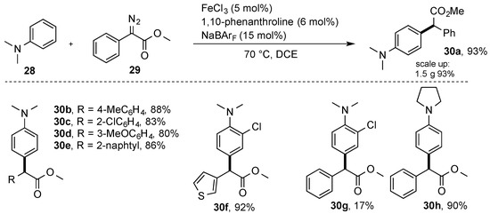 In 2015, Zhou and coworkers studied the reaction of donor–acceptor diazo compounds 29 with electron-rich aromatics 28. Using a simple, non-porphyrin iron complex, the authors were able to demonstrate the C(sp2)-H functionalization reaction of N,N-dialkyl aniline derivatives (28) with high yield and selectivity. In all cases, selective C-H functionalization in the 4 position occurred, which could be rationalized by the high nucleophilicity of N,N-dialkyl aniline derivatives in the para position. From the viewpoint of the catalyst, a very simple iron catalyst was used that could be obtained in situ from FeCl3, 1,10-phenanthroline, and NaBArF (Scheme 10) [35]. More recently, Deng and coworkers reported on a similar transformation using a bis(imino)pyridine iron complex, which could be used in the direct C-H functionalization of N,N-dimethylaniline 28 to give 30a with a 71% yield [36].