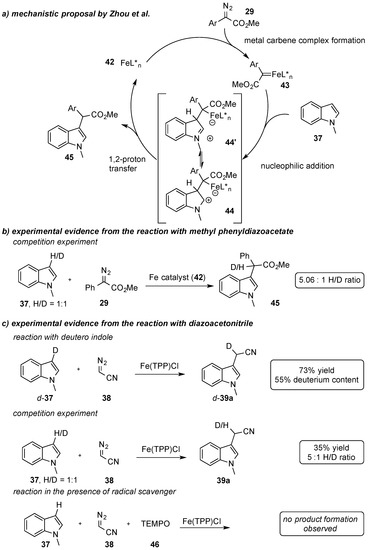 To date, various proposals for the C-H functionalization of indole heterocycles have been reported in the literature. One important mechanistic proposal suggests the initial formation of an iron carbene complex 43 that undergoes nucleophilic addition of an indole followed by a [1,2]-proton transfer reaction (Scheme 14a). Zhou and coworkers reported a KIE (= kinetic isotope effect) of 5.06 in the reaction of N-methyl indole and deuterated N-methyl indole, which led them to conclude a proton-transfer reaction to be the rate-determining step (Scheme 14b) [38]. Koenigs, Weissenborn, and coworkers observed a similar trend in the reaction of N-methyl indole and deuterated N-methyl indole with diazoacetonitrile using both a synthetic and an enzymatic iron catalyst. However, investigations using TEMPO 46 as a radical scavenger revealed a complete inhibition of the C-H functionalization reaction. Based on these experimental data, the authors assumed a radical reaction, yet it was not yet clear in which particular reaction step radical intermediates were involved (Scheme 14c) [39].
