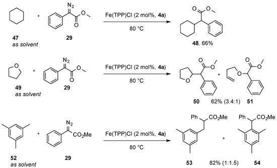 The application of non-toxic and highly active iron catalysts has blossomed in the last few years, and today, iron-catalyzed carbine-transfer reactions have emerged as an important, environmentally benign strategy by which to conduct C(sp3)-H bond functionalization reactions. In this context, Woo and coworkers reported their studies in C-H functionalization reactions of cyclohexane 47 and tetrahydrofuran 49 as substrates. Using a donor–acceptor diazoalkanes (29) as a carbene precursor and a Fe(TPP)Cl (4a) catalyst, the authors demonstrated proof-of-concept studies in this research area. Cyclohexane 47 underwent smooth C-H functionalization to give product 48 with a 66% yield. No C-H functionalization was observed when ethyl diazoacetate 2 or dimethyl diazomalonate 25 were used as carbene precursors. Similarly, tetrahydrofuran 49 underwent selective C-H functionalization reaction in the β position (50). A byproduct arising from ring-opening of the THF ring was observed as a minor reaction product 51 with ~20% yield. In a competition experiment with mesitylene (52) as a substrate, the authors obtained the product from C(sp3)-H bond and C(sp2)-H bond in a 1.5:1 ratio (Scheme 15) [34].