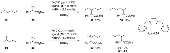 The C-H functionalization of cyclohexane represents one of the simplest examples, as all C-H bonds within cyclohexane are identical. Contrarily, linear or branched hydrocarbons are more challenging, as different C-H bonds are present that need to be differentiated by the catalyst. Zhu et al. studied the reaction of these substrates with donor–acceptor diazoalkanes using an iron catalyst. When n-hexane 56 was used as a substrate, selective C-H functionalization of secondary C-H groups occurred, but without any meaningful selectivity of the C2 vs. C3 positon. When studying 2-metylpentane 59, the C-H functionalization occurred preferentially at the tertiary C-H group. No C-H functionalization of primary C-H bonds was observed, and the reactivity order for the C-H functionalization decreased from tertiary > secondary > allylic/benzylic >> primary C-H bonds (Scheme 16). It is of note that this catalyst can be applied in the C-H functionalization of cyclohexane with turnover numbers of up to 690 on gram scale. In this reaction, the authors observed a KIE of 2.0 for kH/kD [42].