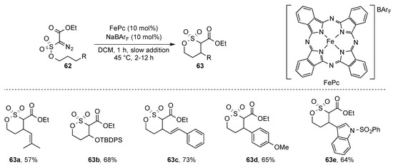 While intermolecular C(sp3)-H functionalization reactions suffer from missing selectivity and reactivity, the development of intramolecular processes would enable important steps to be taken in the understanding of iron-catalyzed C(sp3)-H functionalization. In this context, the White group explored an intramolecular cyclization via C-H functionalization using an iron phthalocyanin complex as the carbene-transfer catalyst; importantly, weakly coordinating counterions needed to be used to increase the electrophilicity of the iron complex. Under these conditions, the bis-acceptor diazoalkanes (62) underwent smooth intramolecular C-H functionalization reaction to yield product 63 in moderate to good yields with broad functional group tolerance (Scheme 17). It is important to note that the C-H functionalization reaction selectivity occurred in the allylic, benzylic position or in the α position to a heteroatom [43].