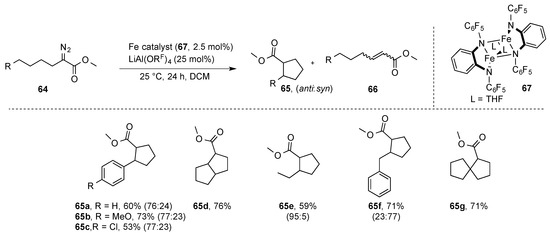 Recently, Costas and coworkers reported on the intramolecular functionalization of C(sp3)-H bonds using the electrophilic [Fe(Fpda)-(THF)]2 complex (67) as catalyst and a lithium salt with a weakly coordinating counterion as a co-catalyst. Importantly, the lithium salt is required to activate the diazoester under mild conditions, while the iron complex is needed for the actual carbene-transfer reaction. Following this strategy, intramolecular C-H functionalization reactions of C(sp3)-H could be realized to selectively obtain the five membered ring products (65). Following this strategy, bi- and spirocyclic systems were synthesized (Scheme 18). Under these conditions, the five membered ring was is favored, e.g., over benzylic C-H functionalization (65f). The formation of α,β-unsaturated esters (66) occurred via a β-hydride elimination reaction [44].