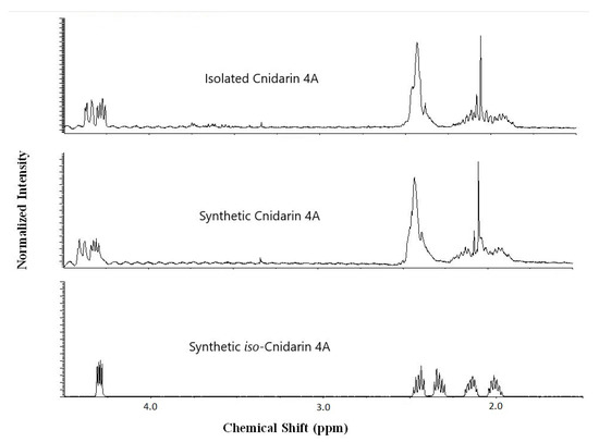 1H-NMR of cnidarin 4A (1) vs. synthetic samples of cnidarin 4A (1) and iso-cnidarin 4A (4) (300 MHz; 1 in D2O/100 mM deuterated formic acid and 4 in D2O).