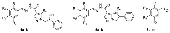 Compounds 4a–k and 5a–k (Scheme 1, Table 1) were obtained by refluxing the suitable benzaldehydes 8a–m solved in a mixture of absolute ethanol/methanol (7:3) in the presence of the pyrazolylcarbohydrazides 7, 10 or the imidazopyrazolyl carbohydrazide 12, respectively.