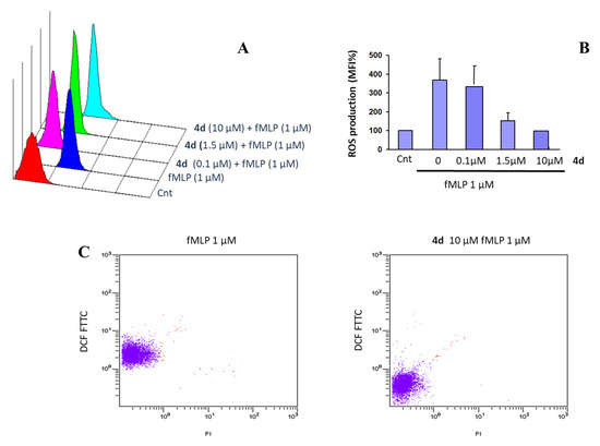 Modulation of neutrophil oxidative metabolism and cell vitality assessed by flow cytometric analysis in the presence of propidium iodide (PI). Representative images relative to evaluation of compound 4d in formyl-methyl-leucyl-phenylalanine (fMLP)-activated neutrophils. (A): reactive oxygen species (ROS) intracellular level reduction (B): dose-dependent effect of compound on ROS reduction (C): cell vitality determined by PI method. Data are expressed as mean ± SD and are representative of four separate experiments.