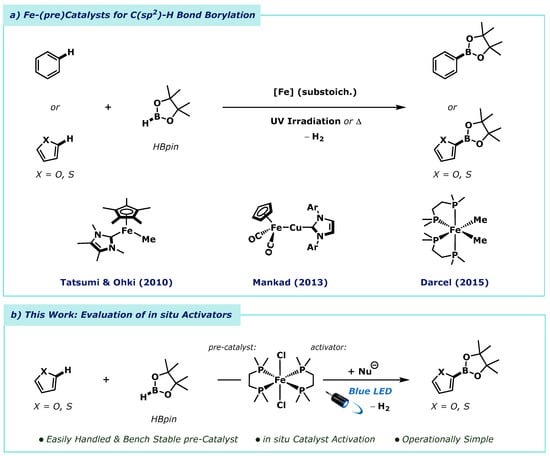 Tatsumi and Ohki showed that arenes would undergo thermally promoted C(sp2)-H borylation using an N-heterocyclic carbene cyclopentadienyl iron(II) alkyl complex [NHC(Cp*)FeMe] as a catalyst in the presence of tert-butylethylene (Scheme 1a) [35]. Mankad applied heterobimetallic Fe-Cu and Fe-Zn complexes under continuous ultraviolet light irradiation to arene C(sp2)-H borylation [36]. Similarly, Darcel and co-workers reported the use of a bis(diphosphino) iron(II) dialkyl and dihydride complexes for arene C(sp2)-H borylation, again under continuous ultraviolet light irradiation [37]. While these landmark reports are highly significant developments, all require the prior synthesis of sensitive inorganic complexes which are synthetically challenging and difficult to handle for the non-specialist practitioner, thus limiting use by the broader synthetic community.